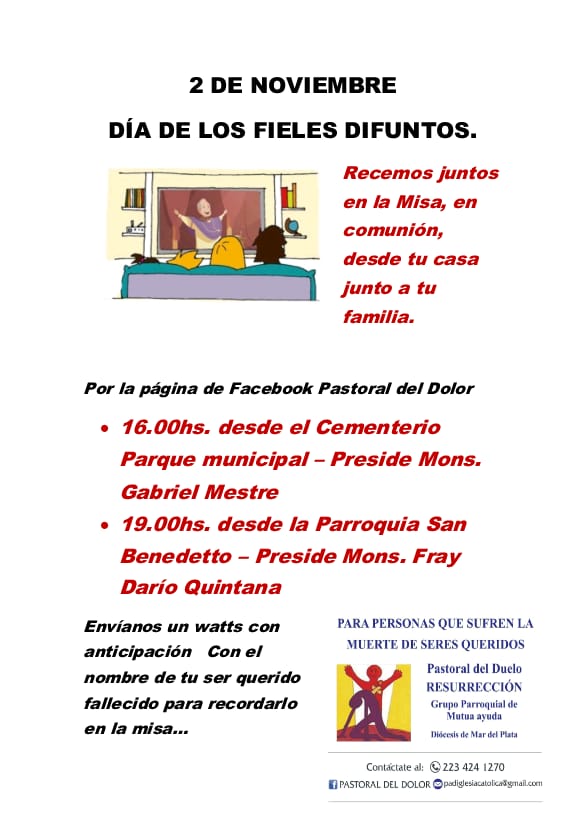 Enviamos un whatsapp al 223 424 1270 con el nombre de tus seres queridos y serán incluidos en las intenciones de las Misas. O enviar un mail a padiglesiacatolica@gmail.com