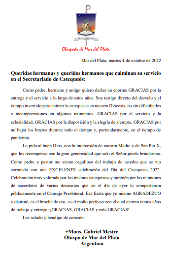 El padre obispo Gabriel envió una carta de agradecimiento público a los integrantes del Secretariado de Catequesis.