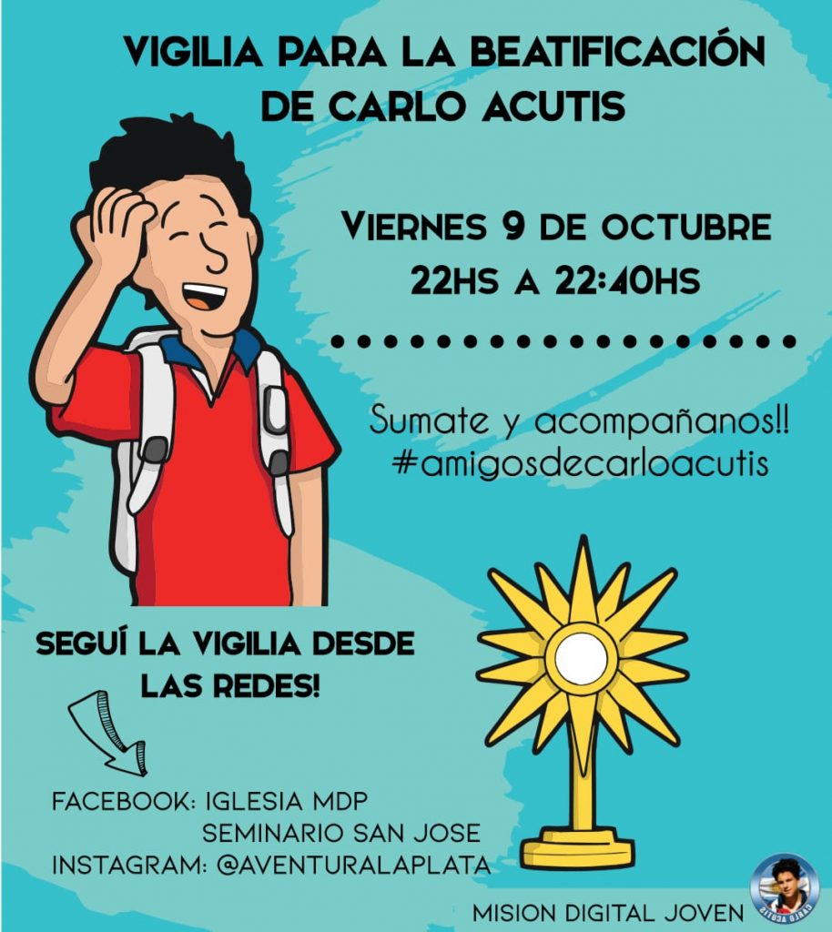 Los seminaristas de Mar del Plata dirigirán este viernes a las 22hs una adoración eucarística en vigilia por la beatificación de CARLO ACUTIS que será el sábado 10 de octubre en Asis. Los jóvenes van reflexionar distintas frases de Carlo para poder incorporarlas a nuestras vidas. Esta es una actividad motivada por los jóvenes de la Diócesis y está destinada a todas las personas que quieran adentrarse en la breve pero fructífera vida de Carlos Acutis, un joven ejemplar.