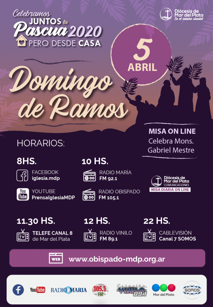 Bajo la consigna “Celebremos la Semana Santa en Casa”, que el Obispado dispuso para toda la diócesis en cumplimiento de las disposiciones sanitaria, se dieron a conocer las transmisiones de la Misa de Ramos que oficiara el padre obispo Gabriel Mestre el próximo domingo 5 de abril.