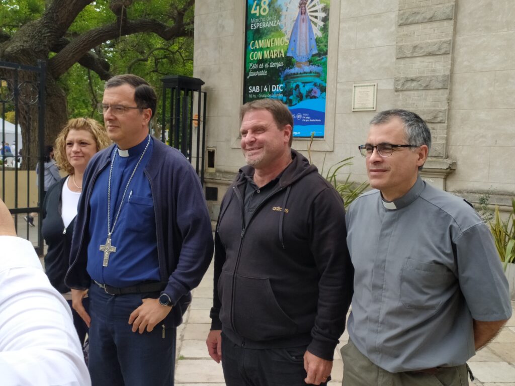 En la conferencia de prensa del padre Obispo Gabriel ofreció detalles de la 48 Marcha de la Esperanza junto al equipo organizador: diácono Marcelo Lovera, Silvana Calzada y Ricardo Garone.