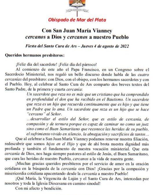 Queridos hermanos presbíteros: ¡Feliz día del sacerdote! ¡Feliz día del párroco! Al comienzo de este año el Papa Francisco, en un Congreso sobre el Sacerdocio Ministerial, nos regaló un bello discurso donde habla de las cuatro cercanías del presbítero: con Dios, con el obispo, con los hermanos sacerdotes y con el Pueblo. Hoy, al celebrar al Santo Cura de Ars comparto dos breves textos del Santo Padre, de la primera y cuarta cercanía: