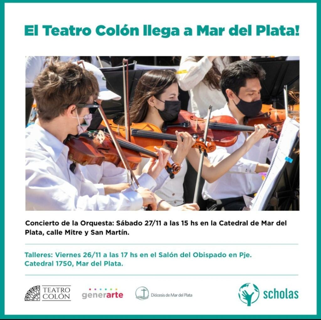 Este sábado 27 a las 15hs , en la Iglesia Catedral, en el marco de la fiesta de Santa Cecilia habrá un concierto de la Orquesta estable del teatro Colón de Buenos Aires, junto con el Proyecto Scholas del Santo Padre en el marco del convenio con el Obispado de Mar del Plata.
