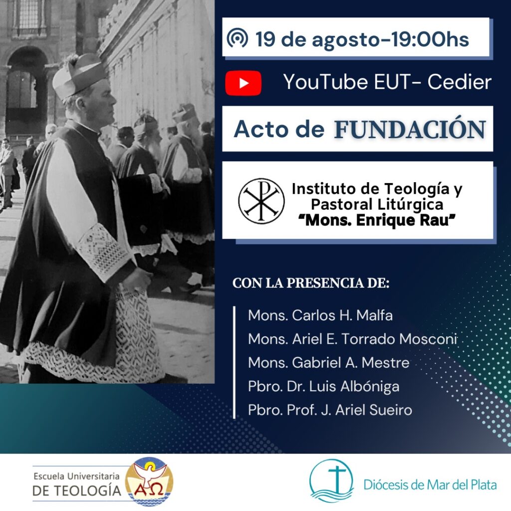 El Instituto de Teología y de Pastoral Litúrgica “Mons. Enrique Rau” tendrá su acto académico de creación el viernes 19 de agosto a las 19 horas con transmisión por el canal de YouTube de la EUT, en las primeras vísperas de un nuevo aniversario de la muerte de Mons. Rau. En el acto estarán presentes nuestro obispo Mons. Gabriel Mestre, Mons. Carlos Malfa que hará una semblanza de Mons. Rau, de quien fuera su secretario, y Mons. Ariel Torrado Mosconi como presidente de la Comisión Episcopal de Liturgia; también contará con la presencia del rector de la EUT, Pbro. Dr. Luis Albóniga y del director del Instituto, Pbro. Prof. Ariel Sueiro.