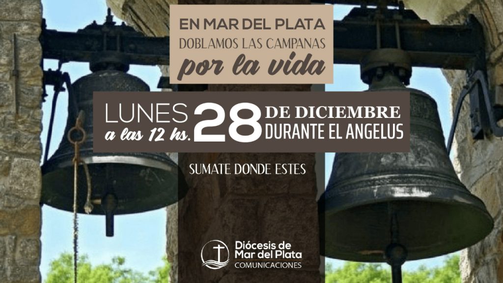 El lunes 28 de diciembre se realizará un campañazo por la vida con una campaña que se llamara “DOBLAMOS LAS CAMPANAS POR LA VIDA” a las 12hs exactamente mientras se reza el Ángelus. A esa hora todas las iglesias harán sonar las campañas al unísono en toda la diócesis junto con una campaña por Redes Sociales que diga EN MAR DEL PLATA LAS CAMPANAS SUENAN POR LA VIDA…. El obispado invita a los vecinos a sumarse a la campaña con videos de personas de todas las instituciones próvida a que viralicen videos que digan «yo hago sonar las campanas por la vida».