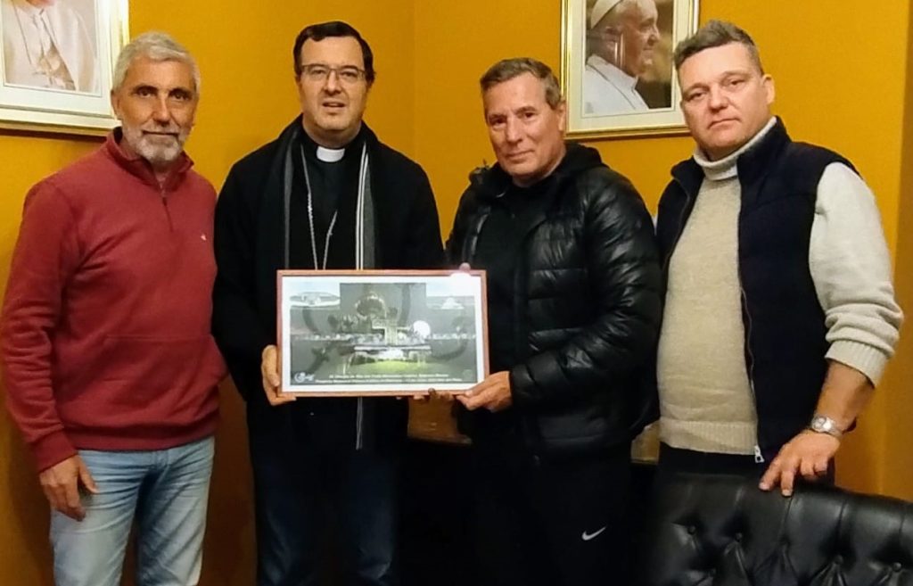 Asimismo le regalaron al obispo Gabriel un cuadro con una imagen del proyecto que pronto comenzara su construcción y una cruz, la primera que lo ingleses colocaron en Malvinas para recordar al soldado argentino desconocido, como símbolo de un trabajo por la paz y en contra de la guerra. Por ultimo solicitaron al padre obispo una bendición.