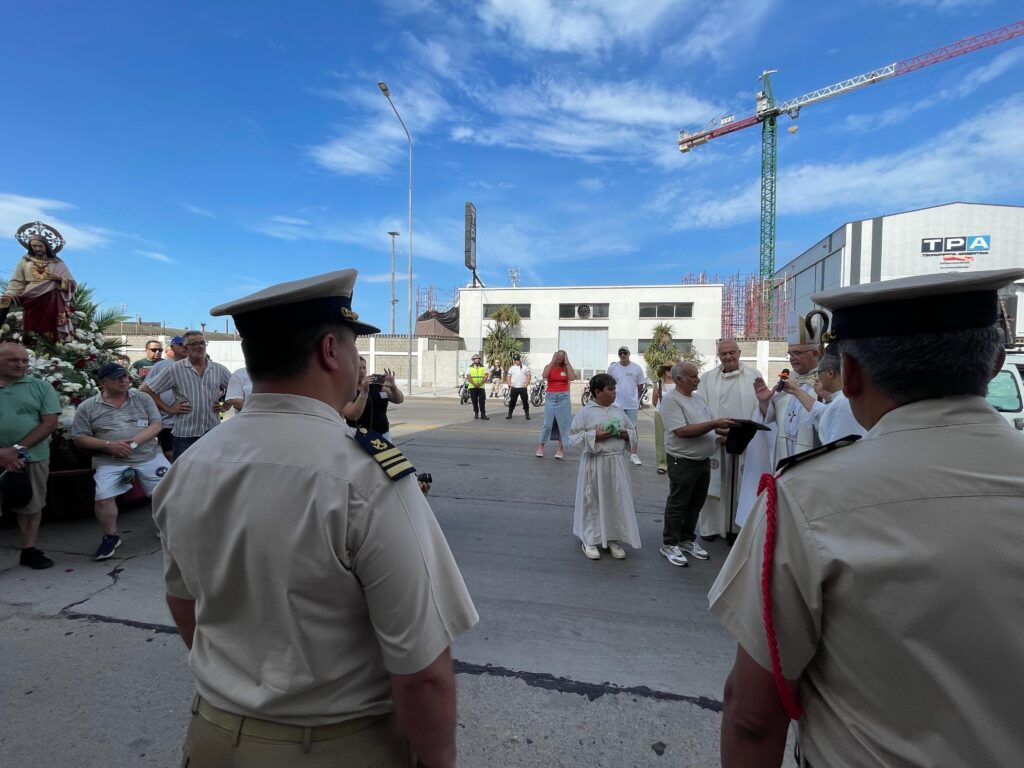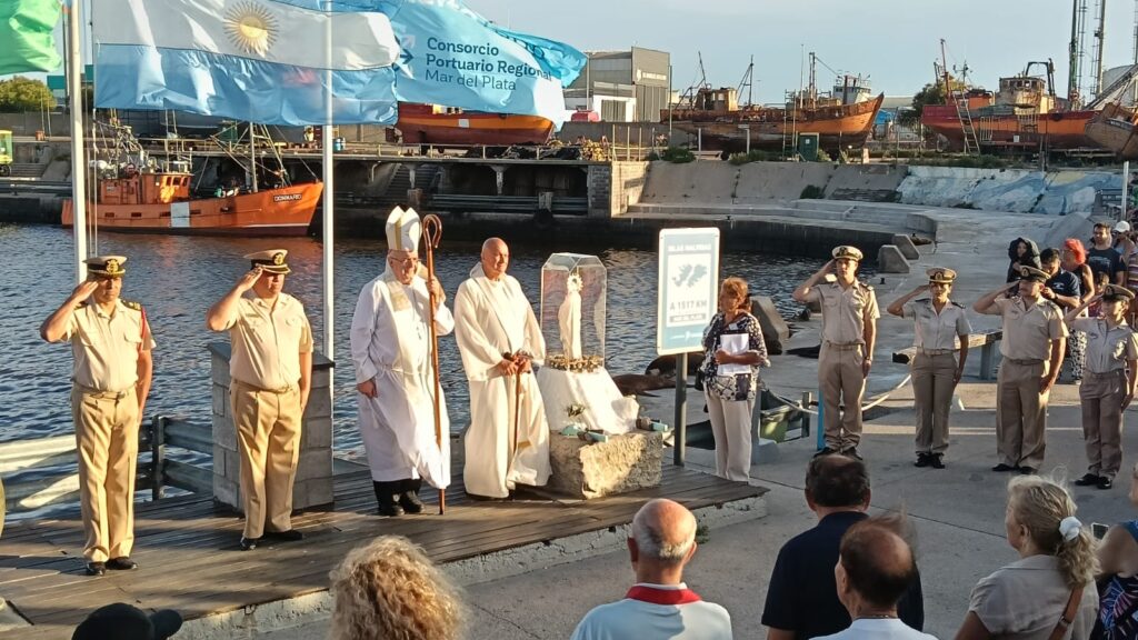 Por la tarde, monseñor Giobando encabezó la procesión que recorrió las calles del puerto y culminó con la tradicional procesión náutica, donde se oró por los pescadores y se recordó a los fallecidos durante su labor en el mar. En distintos puntos del puerto, el Obispo bendijo a los frutos y artes de pesca y presidió un homenaje a los 44 tripulantes del submarino Ara San Juan, con la presencia de personal de la Base Naval, donde se ejecutó un toque de silencio.