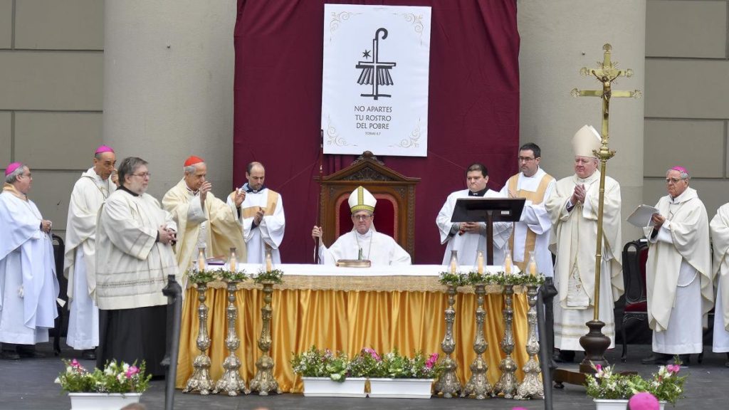 Sobre el altar dispuesto en la Plaza se dispuso el emblema episcopal de García Cuerva que, con la frase «No apartes tu rostro del pobre», está formado por cinco símbolos: la cruz, el báculo, la tierra, el techo de chapa -que refiere a las villas y la realidad de la pobreza- y la estrella.
