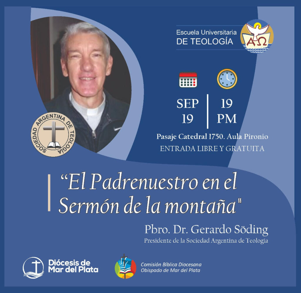 El lunes 19 de setiembre a las 19 hs en el Aula Pironio de la Escuela Universitaria de Teología tendrá lugar la conferencia del P. Gerardo Söding sobre el tema: El Padrenuestro en el Sermón de la Montaña”.