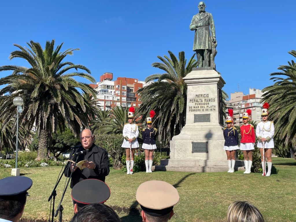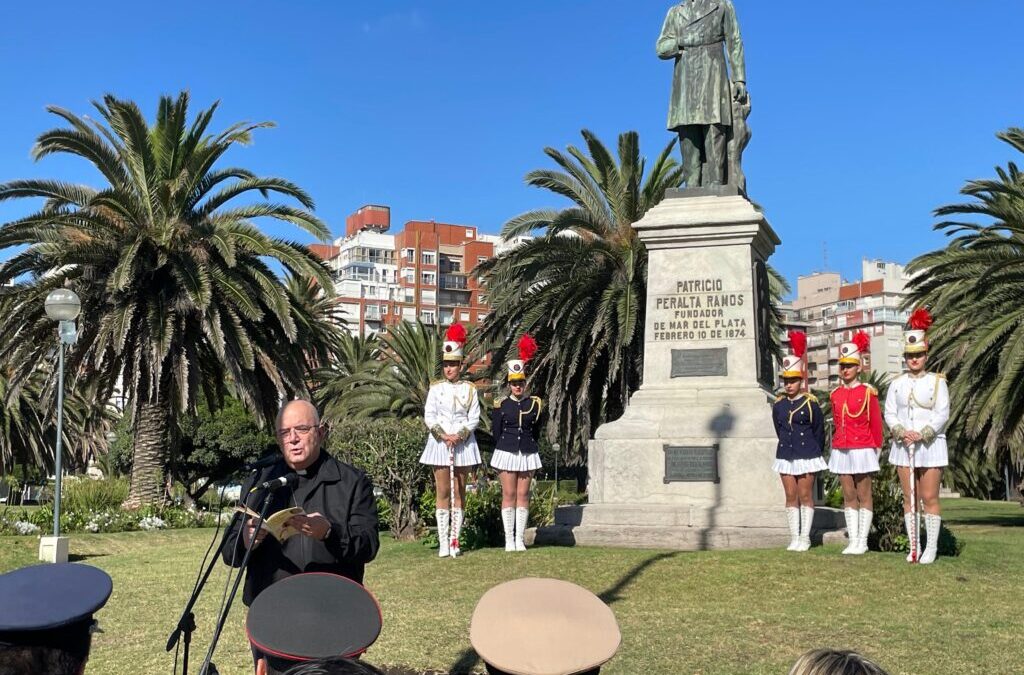 En el marco del acto oficial por el 152° aniversario de la fundación de la ciudad de Mar del Plata, organizado por la Municipalidad y presidido por el intendente interino Agustín Neme, el obispo diocesano de Mar del Plata, monseñor Ernesto Giobando SJ, pronunció la invocación religiosa.
