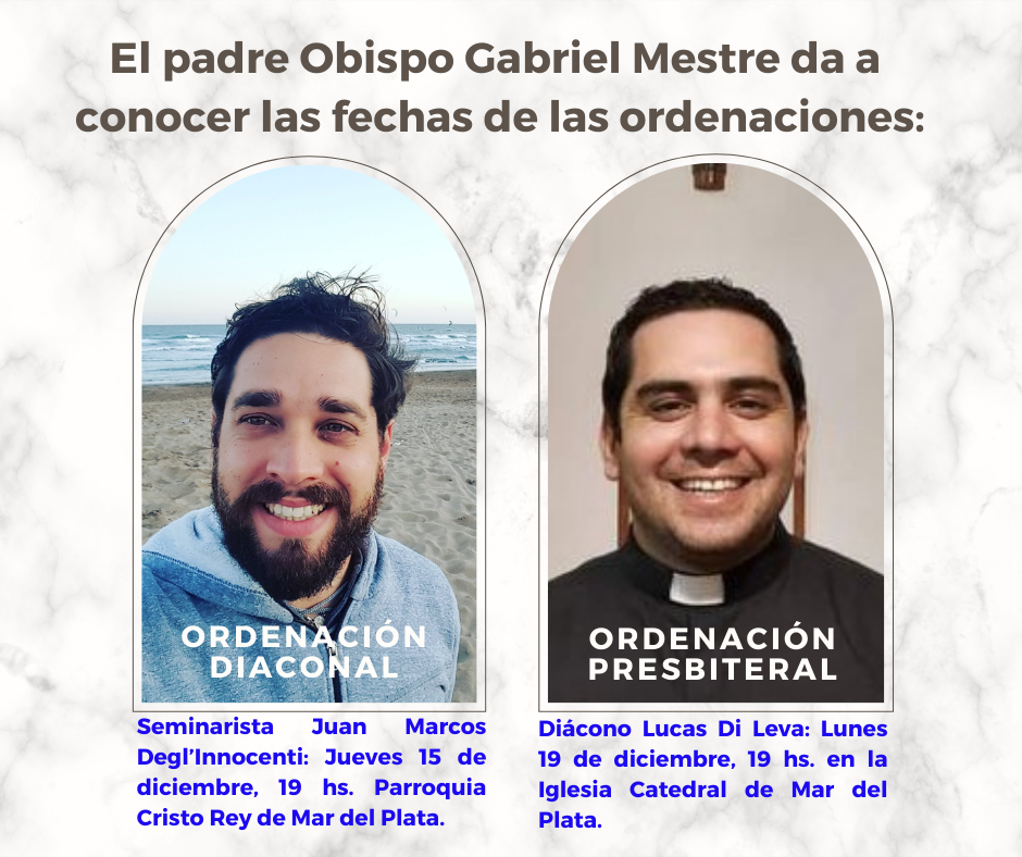 – Ordenación presbiteral del diácono Lucas Di Leva: Lunes 19 de diciembre de 2022 a las 19 hs. en la Iglesia Catedral de Mar del Plata.
