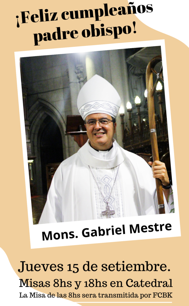 Acompañemos a nuestro obispo con el afecto y la oración. Con motivo de su cumpleaños, este jueves 15 de septiembre, Mons. Gabriel presidirá la misa de 8 (que también se transmite por Facebook) y a las 18 en la Iglesia Catedral.