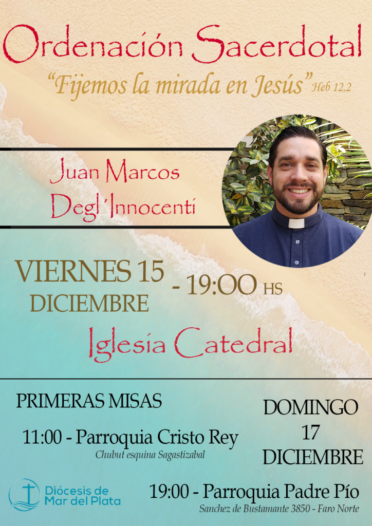 Es el lema de la ordenación sacerdotal del diácono Juan Marcos Degl’Innocenti que se realizará el próximo viernes 15 a las 19hs en la Iglesia Catedral.