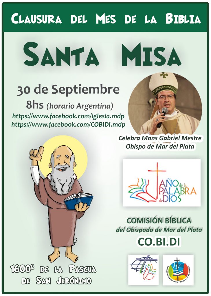 Finalizando el mes de la Biblia el padre obispo Gabriel presidirá la celebración religiosa que se transmitirá por las redes sociales mañana a las 8hs. Es la fiesta de San Jerónimo que fue el gran traductor de la Biblia del griego y del hebreo al latín por encargo del papa Dámaso I.