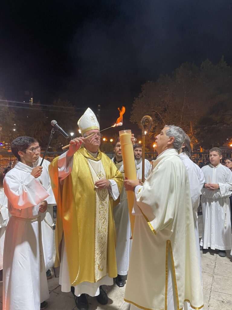 Comenzamos de noche encendiendo el fuego nuevo, bendiciendo ese fuego y así encendemos el cirio pascual. Hemos compartido la luz, nos hemos pasado la velita unos a otros. Compartir la luz también es compartir nuestra vida cristiana. Jesús es la luz del mundo y la luz brilla en las tinieblas.
