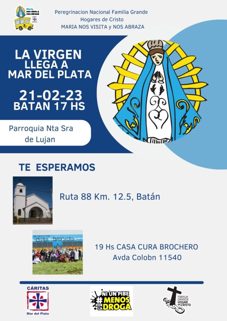 La Familia Grande de los Hogares de Cristo (FGHC), del área de Pastoral de Adicciones de Cáritas  Argentina, continúa con la Peregrinación de la Virgen de Luján 2022-2023 por los distintos centros de los Hogares de Cristo del país y estará en la diócesis de Mar del Plata desde el 21 al 27 de febrero recorriendo varias parroquias y espacios eclesiales.