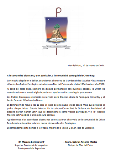 El obispado de Mar del Plata junto con la Orden de los padres Escolapios de la Argentina informan a la comunidad el retorno de la Orden de las Escuelas Pías a nuestra diócesis, desde la Parroquia Cristo Rey y el Jardín Casa del Niño Juanito Bosco.