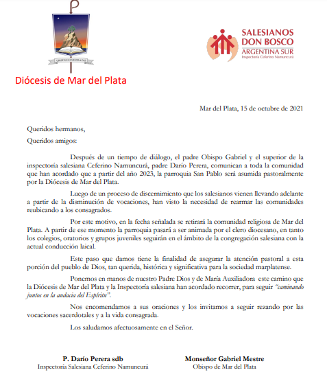 Después de un tiempo de diálogo, el padre Obispo Gabriel y el superior de la inspectoría salesiana Ceferino Namuncurá, padre Darío Perera, comunican a toda la comunidad que han acordado que a partir del año 2023, la parroquia San Pablo será asumida pastoralmente por la Diócesis de Mar del Plata.