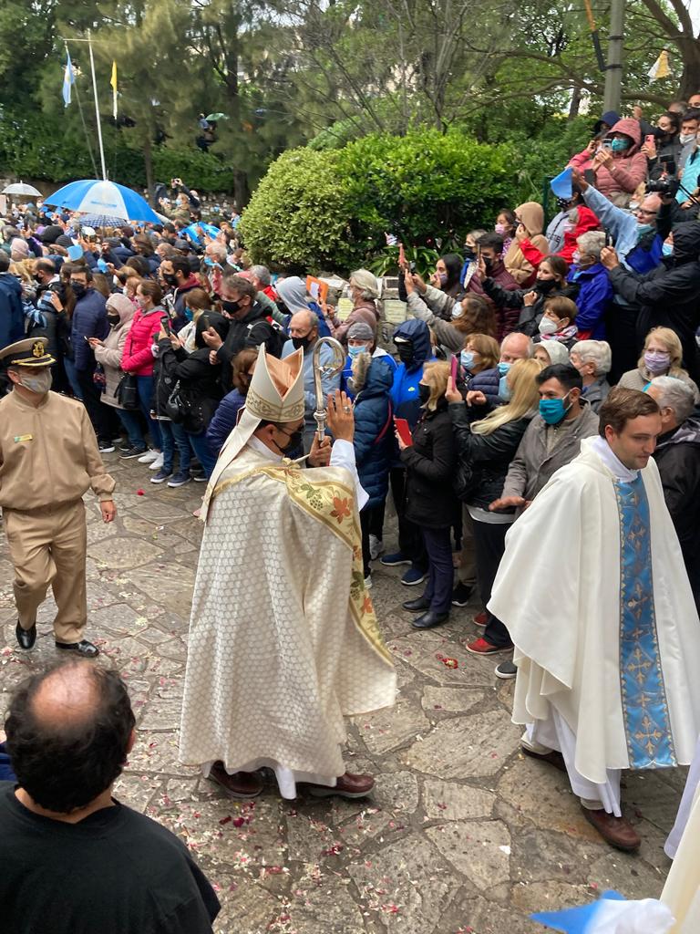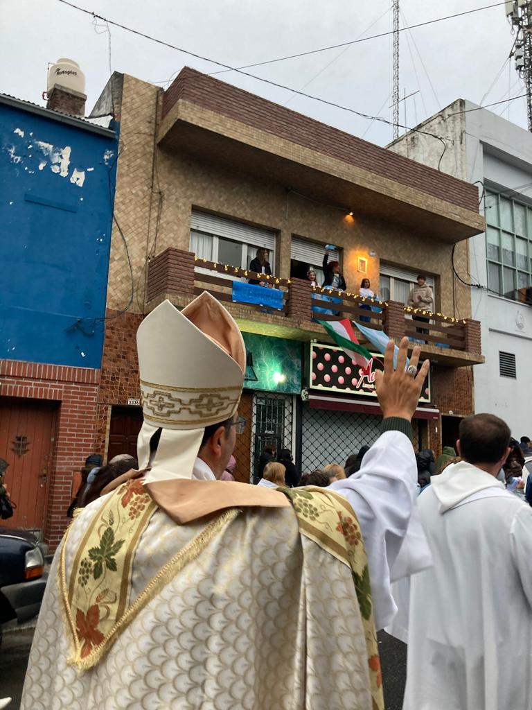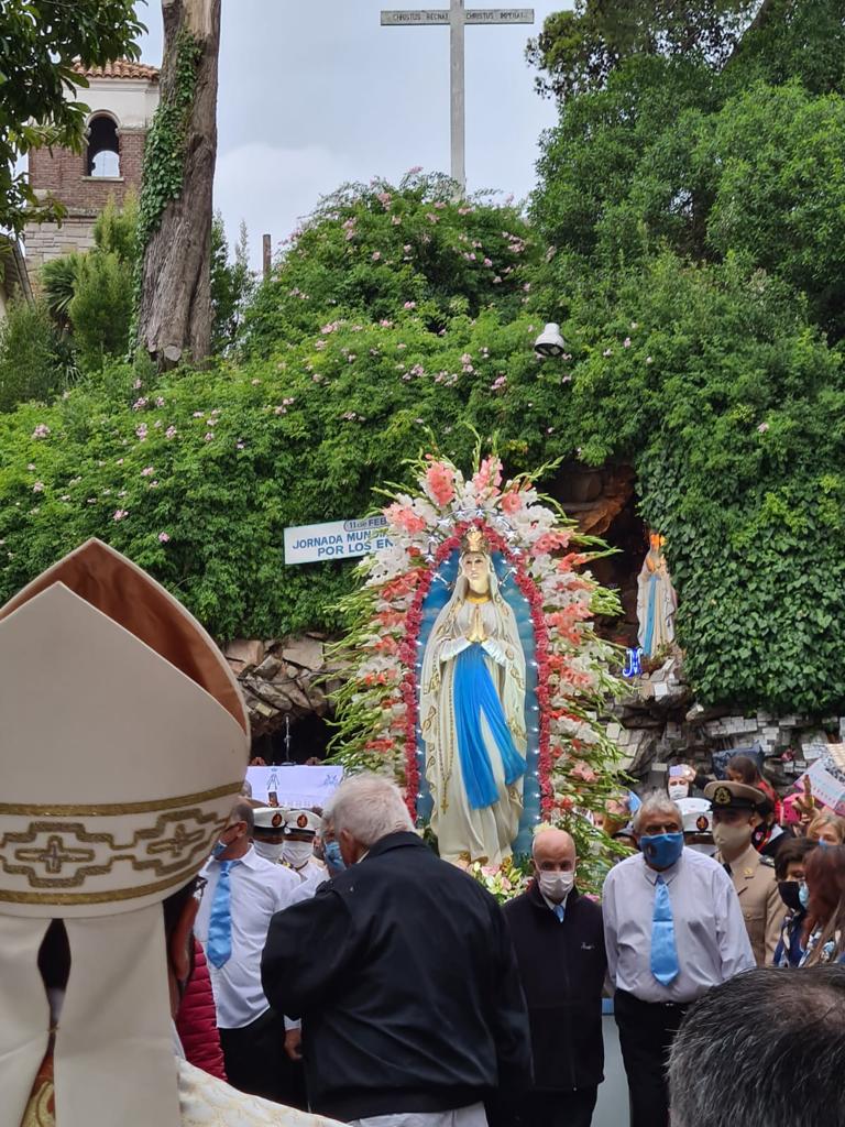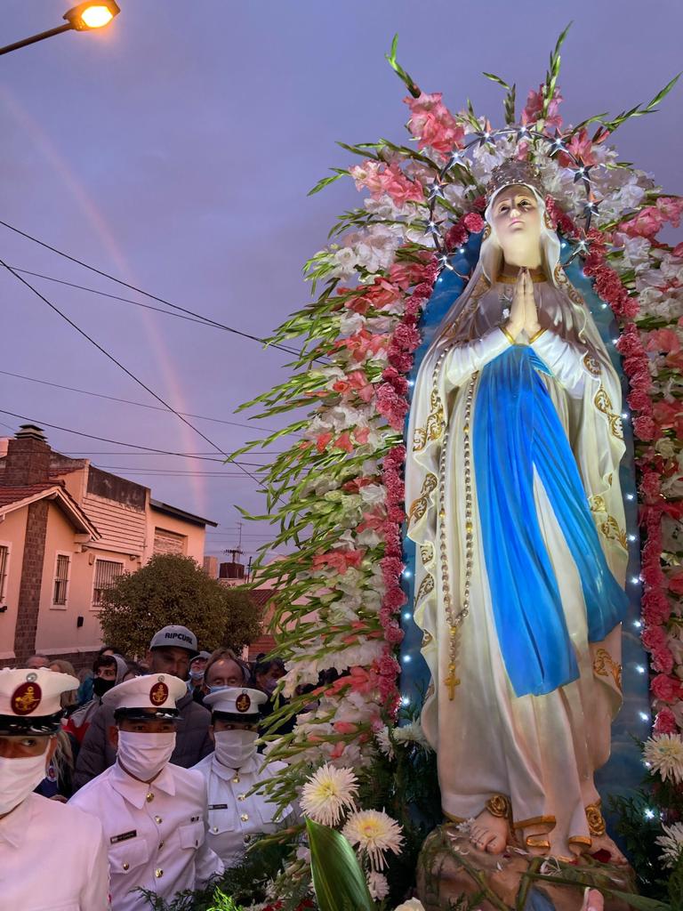 Una vez finalizada la celebración, se procedió a realizar la procesión por el puerto de nuestra ciudad, donde las calles se vistieron de fiesta. Centenares de peregrinos acompañaron a Ntra. Sra. de Lourdes y decenas de balcones con banderas y globos recibían a la Virgen en su camino. La gran demostración de fe, se detuvo en el colegio La Sagrada Familia y ante la imagen de Don Orione ubicada en la plaza Italia, donde el obispo ofreció ofrendas florales. También, ante distintos vecinos que pedían la bendición, en particular para una señora, que ayer cumplió 100 años de vida.
