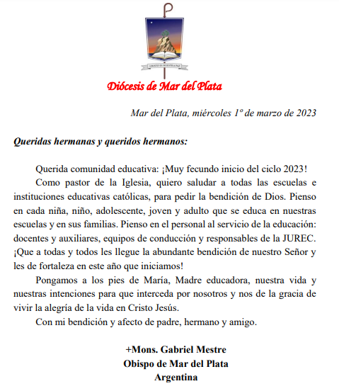 En el inicio pero período escolar 2023 el padre obispo envió un mensaje pidiendo la bendición de Dios para cada niña, niño, adolescente, joven y adulto que se educa en la escuelas episcopales y en sus familias. Y también para el personal al servicio de la educación: docentes y auxiliares, equipos de conducción y responsables de la JUREC.