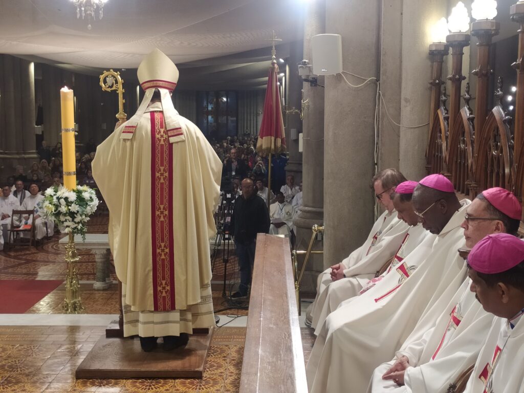 En su homilía el padre obispo Gabriel Mestre dio la bienvenida a la ciudad y la Diócesis de Mar del Plata a todos los asistentes. “Damos gracias a Dios porque estamos reunidos en clave sinodal de diversas partes del mundo para proclamar que la Palabra de Dios es fuente de vida para un mundo frágil”, comenzó el obispo.