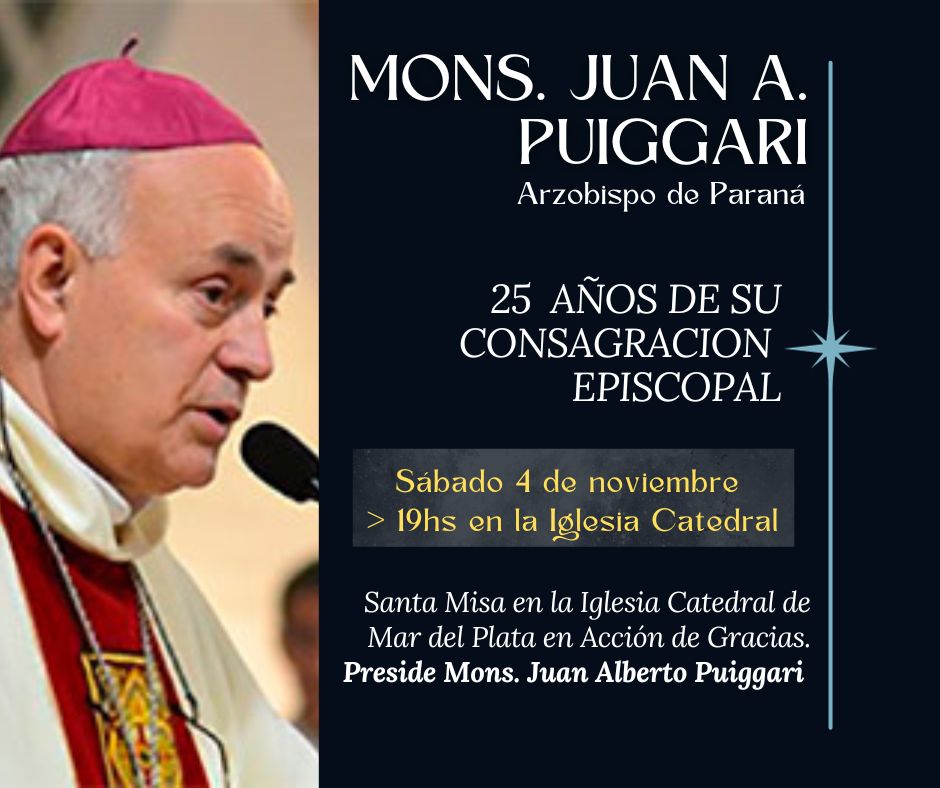 El próximo sábado 4 de noviembre el Arzobispo de Paraná y ex obispo de Mar del Plata, Mons. Juan Alberto Puiggari, presidirá a las 19hs la celebración de Acción de Gracias por los 25 años de su consagración episcopal en la Iglesia Catedral de Mar del Plata junto a la comunidad marplatense.