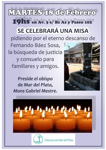 Al cumplirse el primer mes del fallecimiento de Fernando Báez Sosa, el padre Obispo de Mar del Plata, Mons Gabriel Mestre, celebrará esta tarde una Misa a las 19hs en Av 3 e/ Bs As y Paseo 102.
