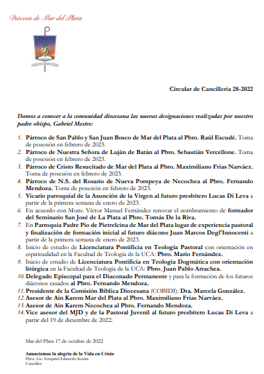 A través de la Circular de Cancillería 28-2022 el obispado da a conocer a la comunidad diocesana las nuevas designaciones realizadas por nuestro padre obispo, Gabriel Mestre: