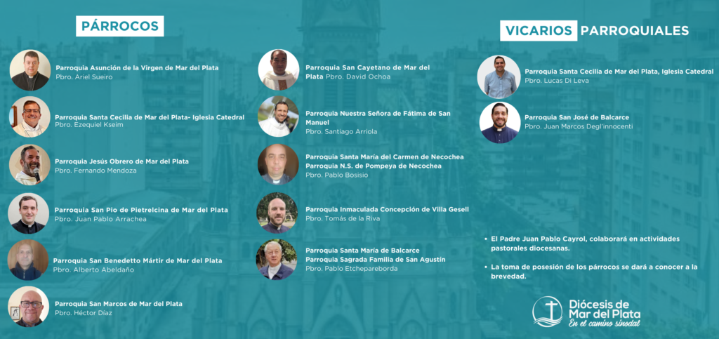 En la ciudad de Mar del Plata, el padre Ariel Sueiro, actual párroco de la parroquia Santa Cecilia, Iglesia Catedral, asumirá como párroco de la parroquia Asunción de la Santísima Virgen, en reemplazo del padre Luis Albóniga, quien fue previamente trasladado temporalmente, por la Santa Sede, a la diócesis de Jujuy. Por su parte, el actual párroco de la parroquia Jesús Obrero, padre Ezequiel Kseim, será quien asuma como párroco de la Catedral, donde será trasladado como vicario parroquial el padre Lucas Di Leva, quien actualmente desempeña el mismo oficio en la parroquia Asunción. En la parroquia Jesús Obrero asumirá como párroco el padre Fernando Mendoza, actual párroco de Santa María del Carmen en Necochea.