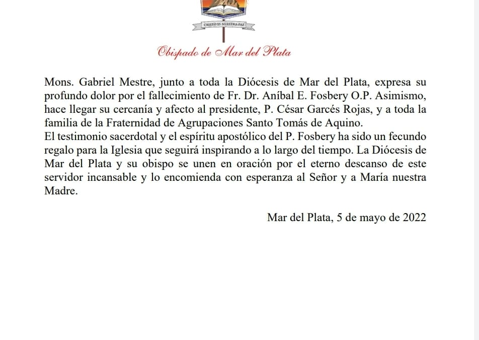PÉSAME DE MONS. MESTRE POR EL FALLECIMIENTO DEL P. FOSBERY 5 May, 2022 | Obispo | 0 Comentarios Enviar comentario Cancelar la respuestaTu dirección de correo electrónico no será publicada. Los campos obligatorios están marcados con *Comentario * Nombre * Correo electrónico * Web Guarda mi nombre, correo electrónico y web en este navegador para la próxima vez que comente.
