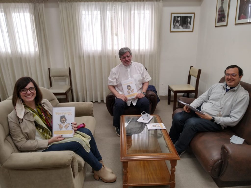 El padre obispo Gabriel Mestre recibió en audiencia a la profesora Carolina Carnicero y al presbítero Pablo Boldrini que presentaron el trabajo final de la Diplomatura que realizaron en formato on line en el El CEBITEPAL del CELAM sobre pastoral juvenil. El proyecto se llama “Ven y verás”  tiene sus partes teórica y práctica y serán implementadas en principio en la parroquia San Andrés de Miramar. El padre Pablo es actualmente párroco de dicha comunidad, a lo largo de su ministerio ha trabajado intensamente en el ámbito juvenil y ha realizado y completado su capacitación en Psicología Social. La profesora Carolina Carnicero se desempeña como docente de la Escuela Parroquial, es agente pastoral en la parroquia, ha realizado parte de su formación en la Escuela Universitaria de Teología (EUT) y desde hace años se desempeña como miembro de la Comisión Bíblica Diocesana (COBIDI).