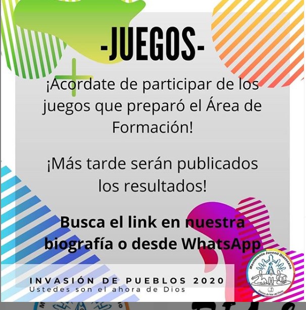 A todo ritmo los 650 jóvenes de toda la diócesis participan activamente de Invasión de Pueblos que se inicio ayer. Este es un espacio de encuentro, comunión, celebración, formación y misión que en este año y por la pandemia, todas las actividades se realizan a través de las redes sociales, con talleres de especialistas, espacios de concursos, entretenimientos y el famoso fogón donde los jóvenes dan rienda suelta a su alegría en el espíritu de Cristo.