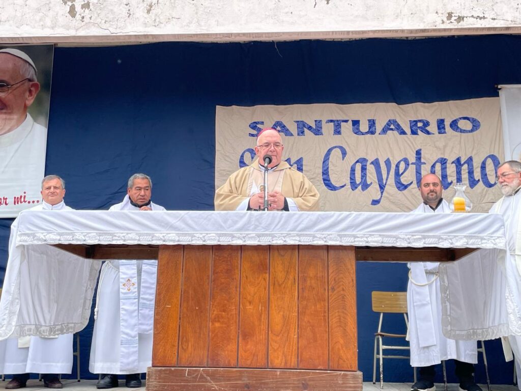 “Los santos están al servicio de Dios y de su Pueblo. San Cayetano no es un político, en el sentido peyorativo que lamentablemente hoy se da a esta palabra. San Cayetano es un santo y nos da ejemplo de cómo hay que servir, especialmente a los más pobres. San Cayetano fue un hombre generoso y desinteresado. San Cayetano se la jugó por los más abandonados, los salió a buscar, se los puso al hombro. Llevaba comida y cuando faltaba la multiplicaba, iban a buscar al canasto de las donaciones y siempre había pan”, explicó el prelado.