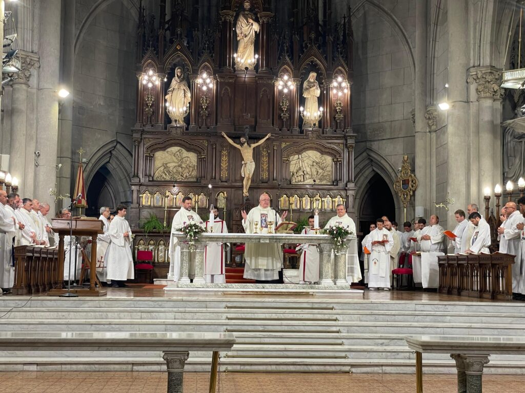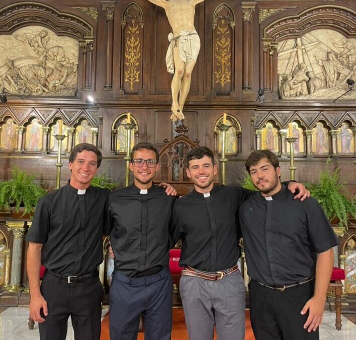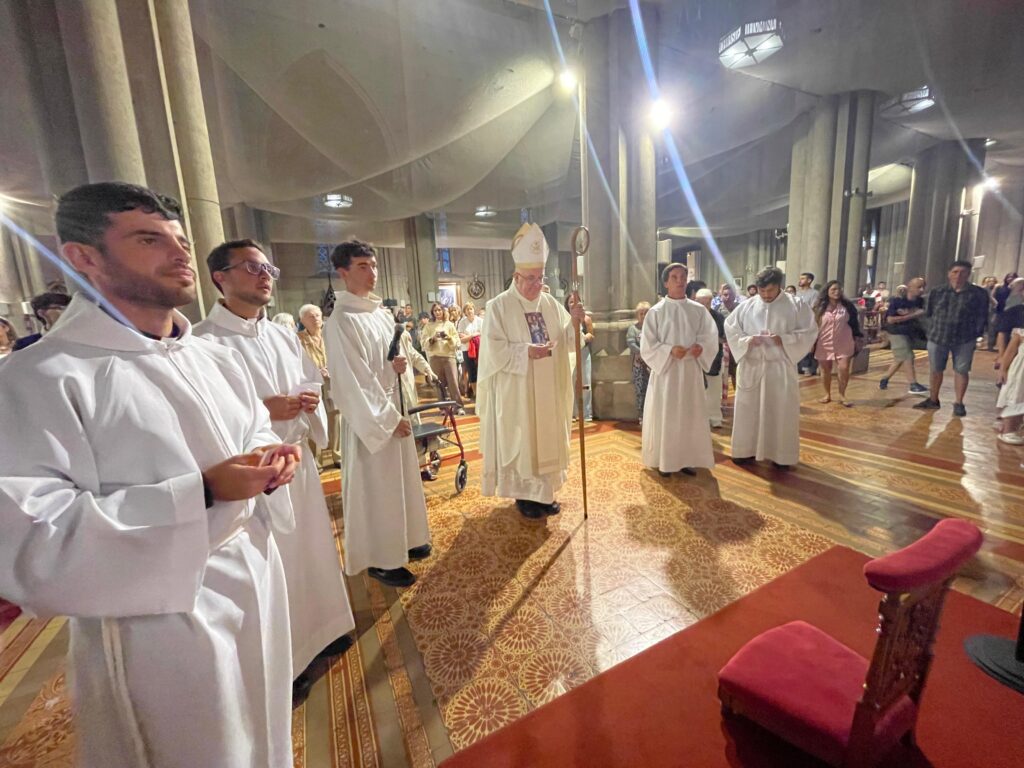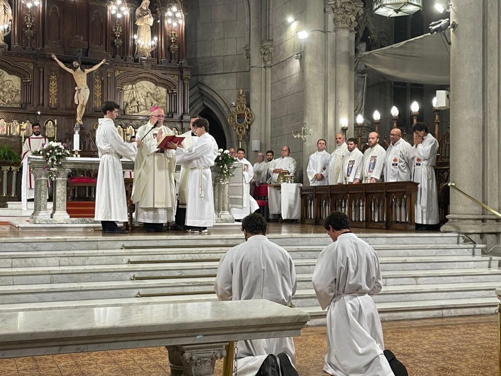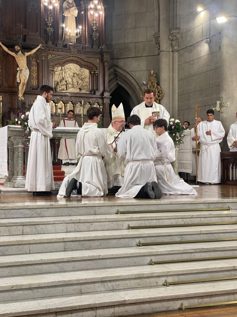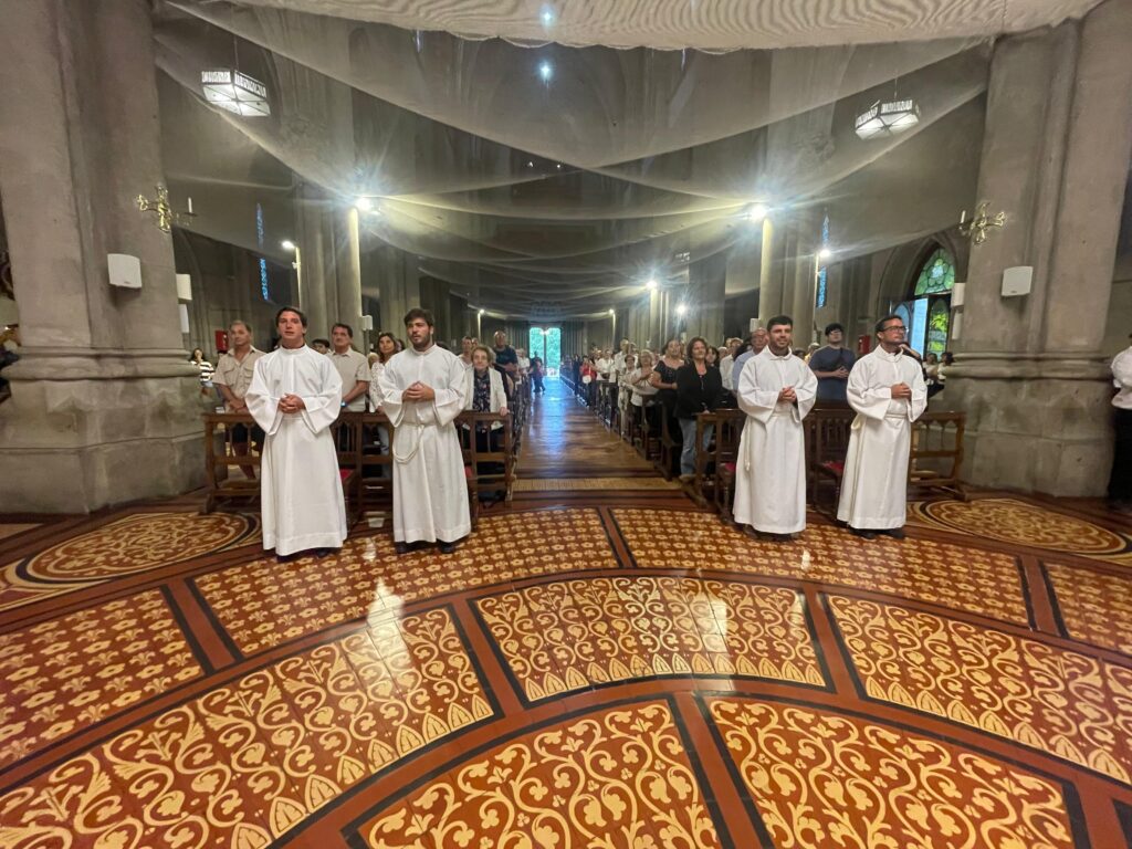 Este miércoles 4 de febrero, el obispo de Mar del Plata, Mons. Ernesto Giobando SJ, confirió ministerios a seminaristas diocesanos en el marco de la Semana Vocacional Diocesana, durante la celebración eucarística que presidió en la Catedral de los Santos Pedro y Cecilia. Concelebraron el vicario general, presbítero Hernán David; el párroco de la Catedral y encargado del acompañamiento de los seminaristas, presbítero Ezequiel Kseim, y el asesor de la Pastoral Vocacional, presbítero Juan Cruz Mennilli, junto a más de 20 sacerdotes.
