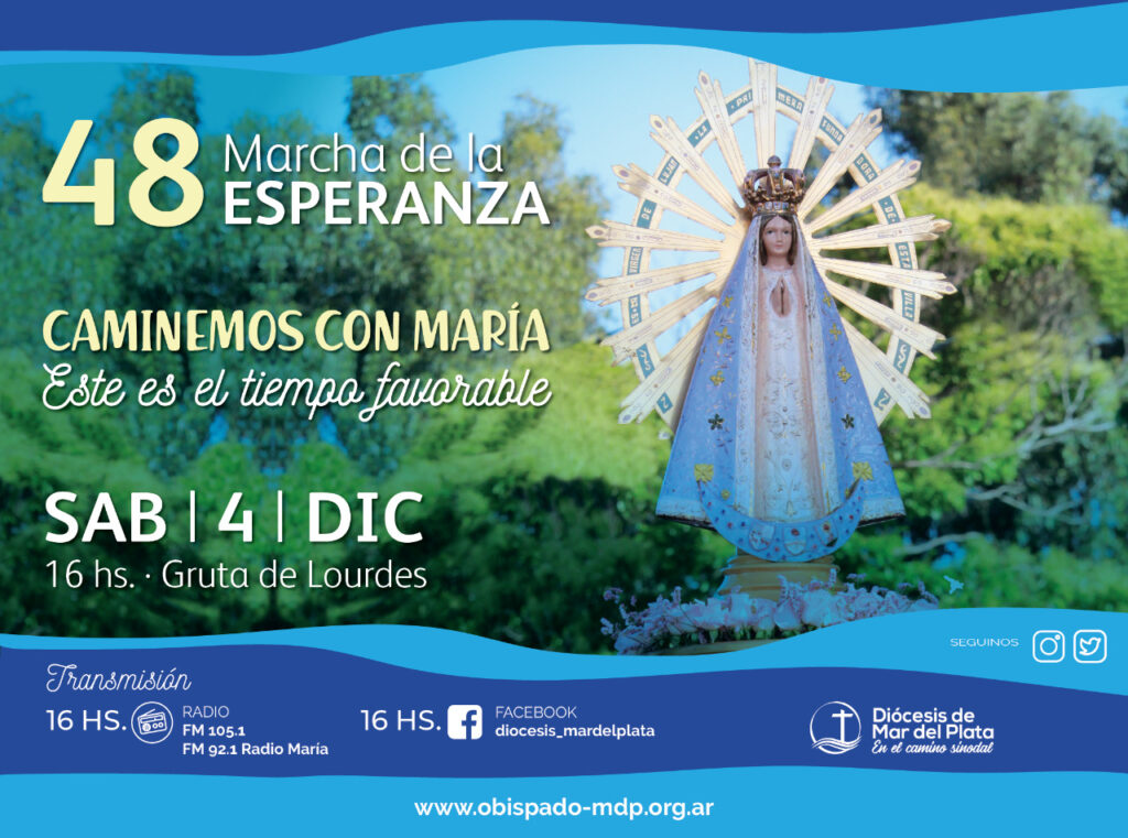 Bajo el lema “Este es el tiempo favorable” (2Co 6,2a), se realizará el próximo sábado 4 de diciembre la 48° Marcha de la Esperanza. La convocatoria es a las 16 hs en la Gruta de Lourdes para peregrinar hacia la Iglesia Catedral donde culminará con la celebración de la Misa. Con todos los cuidados del protocolo sanitario se retomará así, como un signo de esperanza, la tradicional y más significativa expresión de amor a María en nuestra ciudad.