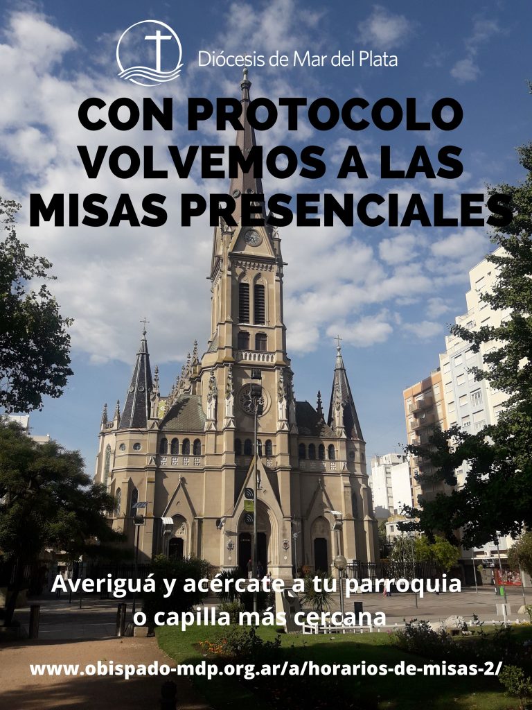 El obispado de Mar del Plata informa que se puede asistir presencialmente a la santa Misa. En las celebraciones se respetan los protocolos vigentes de cada uno de los 9 municipios que componen la diócesis de Mar del Plata. Asimismo comunica que hay horarios de confesiones y atención a los fieles.